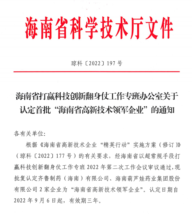 近日,海南省科学技术厅发布的《海南省打赢科技创新翻身仗工作专班办公室关于认定首批“海南省高新技术领军企业”的通知》中显示,批复认定海南70net永乐高药业集团股份有限公司等2家企业为“海南省高新技术领军企业”。认定日期自2022年9月6日起,有效期三年。